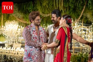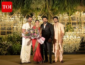 Stepping inside the venue, stars including Allu Arjun, Nani, Ram Charan and Megastar Chiranjeevi were seen warmly congratulating the couple. Producers Dil Raju and Naga Vamsi also marked their presence.