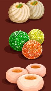 Sweets and fruits are used as offerings in the puja and as prasad after breaking the fast.Â