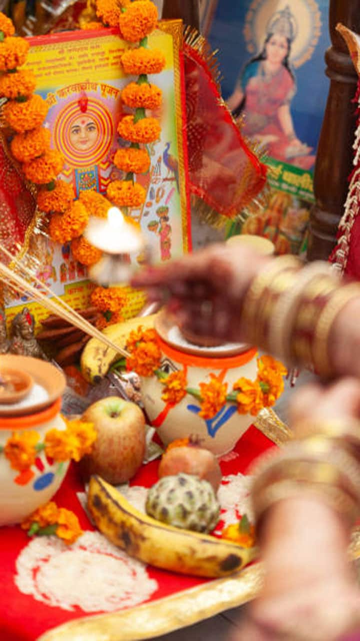 For the puja, a pot filled with water and an earthen or brass pot are required, which is offered to the husband after sighting the moon.Â