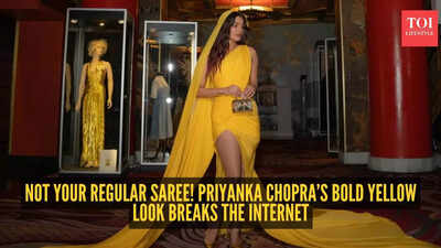 Draped in a striking yellow ensemble, Priyanka looked every bit the global star – but with a strong Indian heartbeat running through the outfit. The silhouette hugged her frame like a contemporary saree, complete with fluid drapes and a dramatic thigh-high slit. The long trail followed her across the carpet, serving full red-carpet drama.
