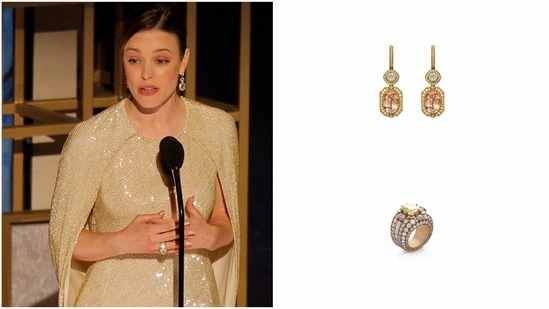 Complementing the luminous gown, McAdams opted for statement pieces from Sabyasachi High Jewellery. Her drop earrings were crafted in 18k gold and set with soft peach-toned morganites framed by brilliant-cut EF VVS-VS diamonds, with a smaller diamond stud leading into the larger faceted stone. The warm blush hue of the gemstones subtly echoed the golden tones of her gown while adding a delicate sparkle near her face. Notably, the same earrings were also worn by Jennifer Lopez at the 83rd Golden Globe Awards earlier this year.