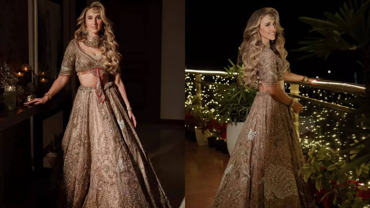 Sophie, soon to be Mrs. Dhawan, absolutely owned the night in a champagne-gold lehenga by Rimple & Harpreet Narula. It shimmered under the lights and honestly looked like it was designed for a dance floor spotlight. The detailing was rich without being over the top – festive, elegant, and very her. She paired it with a choker, gold bangles, a maang tikka and chandelier jhumkas from Hazoori Lal Legacy, and the whole vibe came together beautifully.
