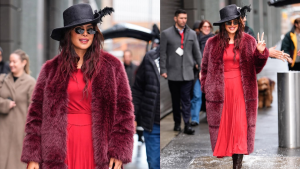 The shoulder drape again mirrored a saree pallu, creating movement and softness. The silhouette remained relaxed yet refined – flattering without feeling restrictive. It was regal, but also quietly rooted in Indian draping traditions.
