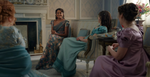 Interestingly, this isn’t Simone Ashley’s first saree-inspired fashion moment in Bridgerton. Back in Season 3, her wardrobe already hinted at Indian influences, though in a more subtle way.