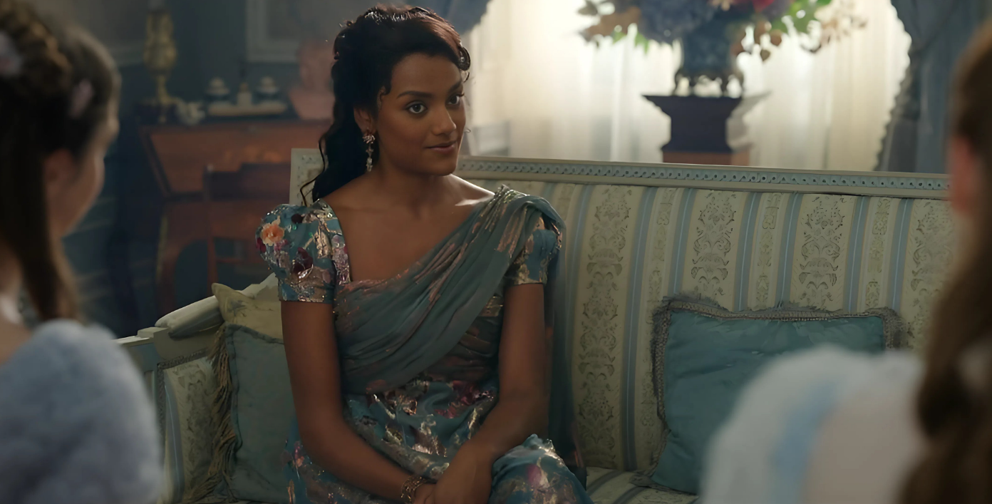 Interestingly, this isn’t Simone Ashley’s first saree-inspired fashion moment in Bridgerton. Back in Season 3, her wardrobe already hinted at Indian influences, though in a more subtle way.