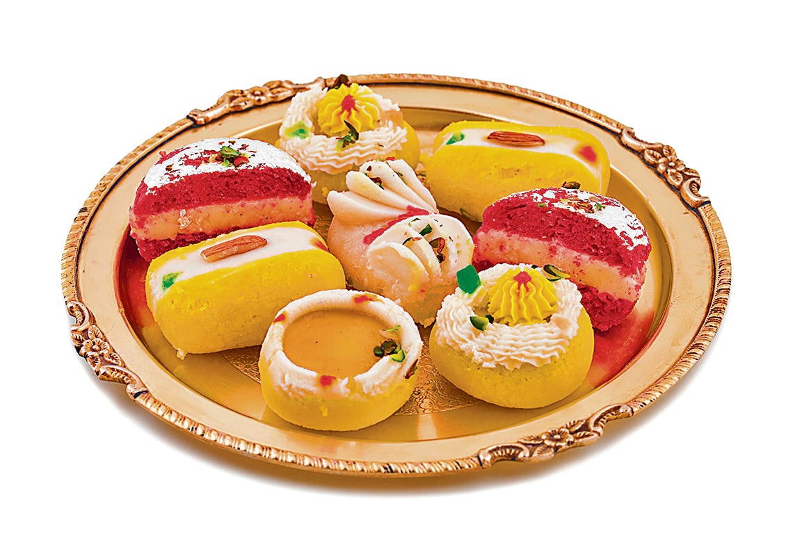 Priced between ₹1,000 and ₹5,000, these mishti platters are not just markers of status but also the creative canvas for sweetshops to showcase innovation. One of the most outlandish tatwa platters resembles an intricate woollen shawl, engraved with faux brown embroidery.