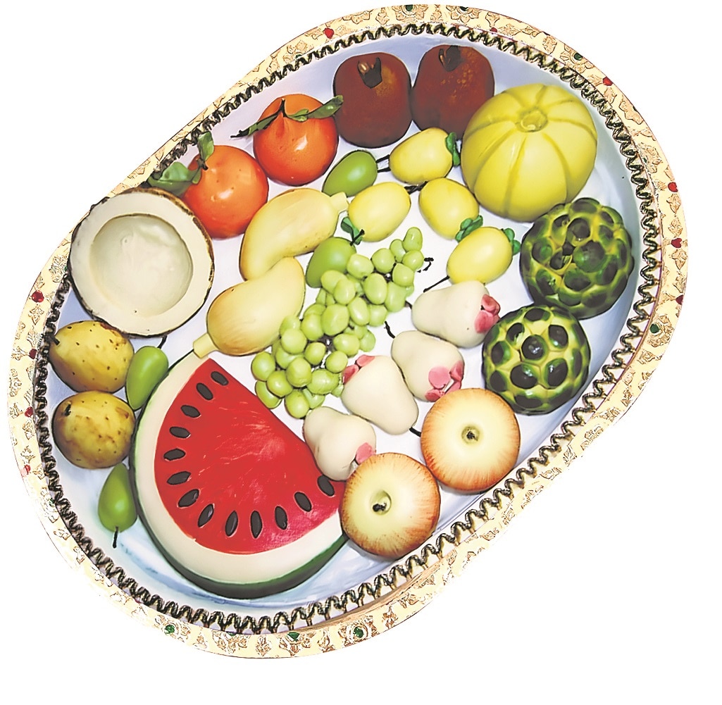 Tatwa mishti platters are not just markers of status but also a creative canvas for sweetmakers. (Above) A platter resembling a fruit salad. (Courtesy Jalbhara Surjya Kumar Modak)