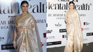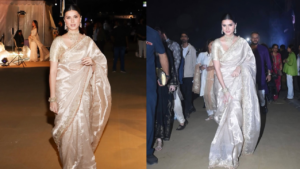 She wore a Banarasi tissue-silk saree by the label Safety Pins, dipped in champagne and molten gold tones, which felt timeless rather than overwhelming. The plain beauty didn’t rely upon embellishments or colour blocking, but the subtle sheen and tonal depth made everything look like a walking dream.