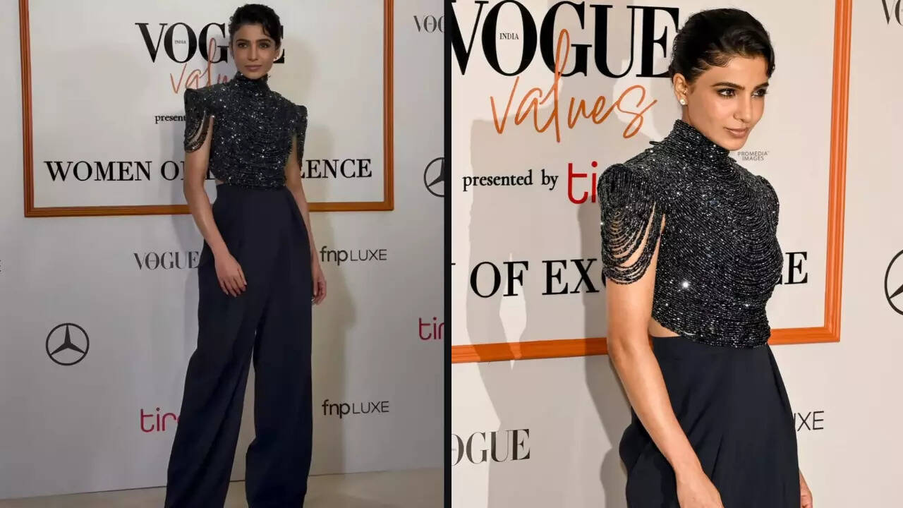For the event, she wore a pale pink full-length gown with a heavily silver-embellished bodice featuring a soft straight flow with minimal pleats, a high round mesh-finish neckline, and full-length fitted net sleeves.