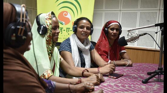 In 2019, with support from the Azim Premji Foundation, Seeking Modern Applications for Real Transformation (SMART), the NGO that runs Radio Mewat, mounted an on-ground intervention in 25 villages in Nuh. Groups of women aged 18-40 were formed. These groups became safe spaces for discussing rights, sharing experiences, and building collective confidence. Radio programmes were heard during narrow casts and discussions facilitated by the Radio Mewat team.