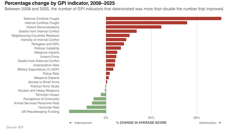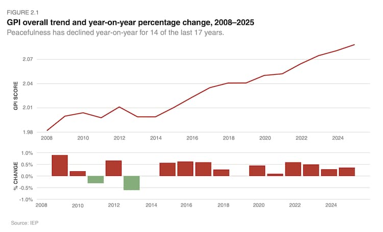 The bloodied and more violent state of the world has started reflecting in words. The Global Peace Index in 2025 highlighted that currently the world is the least peaceful it has been after World War II. “Global peace is at its lowest level since the inception of the Index, while the conditions that precede conflict are the worst since WWII,” the report noted last year. “Global peacefulness has deteriorated every year since 2014, with 100 countries deteriorating over the last decade. There are currently 59 active state-based conflicts – the most since the end of WWII, with 152,000 conflict-related deaths recorded in 2024.”