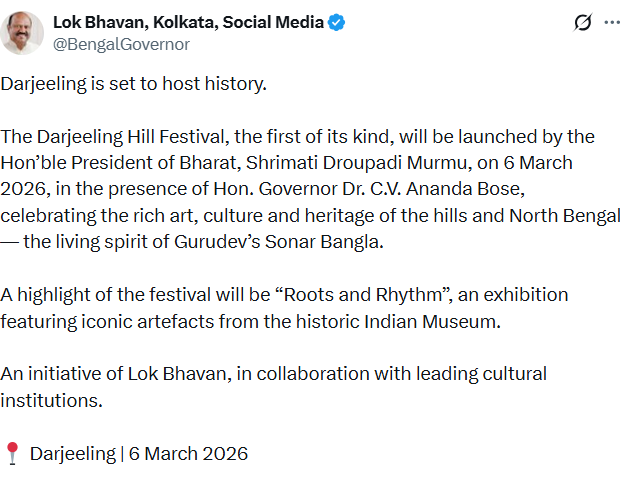 “Darjeeling is set to host history. The Darjeeling Hill Festival, the first of its kind, will be launched by the Hon’ble President of Bharat, Shrimati Droupadi Murmu, on 6 March 2026, in the presence of Hon. Governor Dr. C.V. Ananda Bose, celebrating the rich art, culture and heritage of the hills and North Bengal — the living spirit of Gurudev’s Sonar Bangla. A highlight of the festival will be “Roots and Rhythm”, an exhibition featuring iconic artefacts from the historic Indian Museum,” the Lok Bhavan account shared.