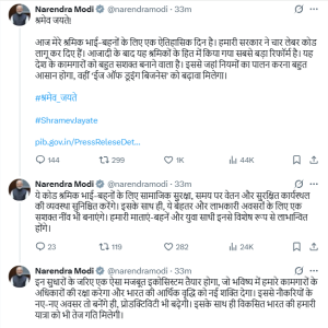 PM Modi termed the move as “the biggest reform in the interest of workers since independence”.”Today is a historic day for my worker brothers and sisters. Our government has implemented four Labour Codes. This is the biggest reform in the interest of workers since independence. It will greatly empower the workers of the country. While it will make compliance with rules much easier, it will also boost ‘Ease of Doing Business’,” he wrote.
