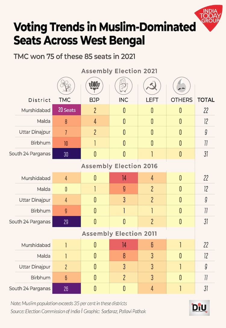 Of the 85 Muslim-dominated seats, the TMC won 75 in 2021