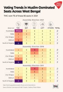 The 2021 election marked a decisive shift. Of the 85 Muslim-dominated seats, the TMC won 75 seats which signalled a consolidation of Muslim votes in its favour.