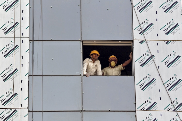 Labourers look out from a window of a data centre building under construction in Gujarat. (Photo: Reuters)