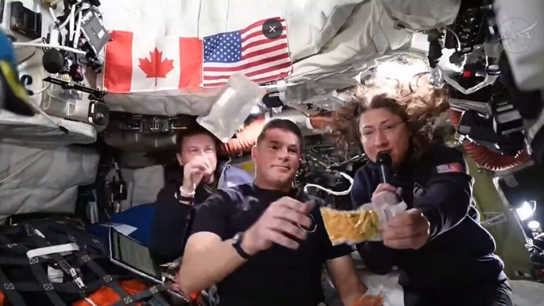 The footage shows astronauts Reid Wiseman, Christina Koch, and Jeremy Hansen enjoying a meal while floating in microgravity.