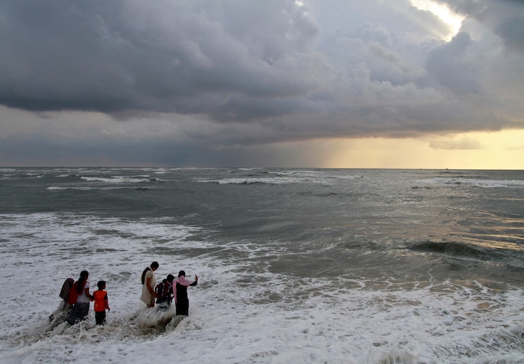 Beachgoers walk in the waters at Fort Kochi beach as clouds hover over the Arabian Sea. (Photo: Reuters)
