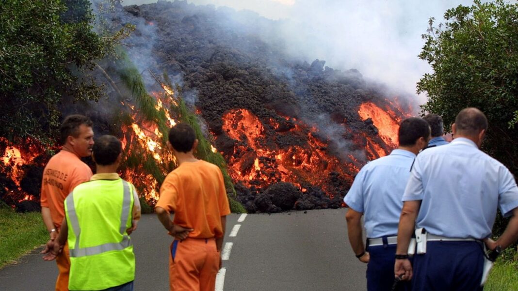 Striking footage shows bright orange lava from the Piton de la Fournaise, a shield volcano on Reunion Island, flowing across Route Nationale 2, a highway, like a fiery river.