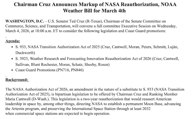 The proposal has bipartisan backing from Committee Chair Ted Cruz and Ranking Member Maria Cantwell.