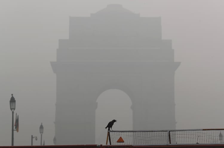 A crow sits on a barricade in front of India Gate amidst smog in New Delhi. (Photo: Reuters)