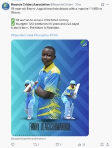 Rwanda batter Fanny Utagushimaninde made history on Friday by becoming the youngest T20I centurion. She achieved the milestone against Ghana in the Nigeria Invitational Women’s T20I Tournament at Tafawa Balewa Square Cricket Oval in Lagos.