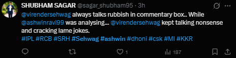 Fans reacted strongly to the exchange, calling out Sehwag and other Hindi commentators over what they perceived as a poor standard of narrative in the opening game of the season. This comes on the backdrop of criticism directed at commentators like Navjot Singh Sidhu and Aakash Chopra, who have faced flak in recent times.
