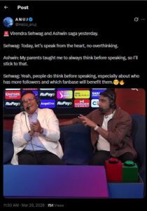 What started out as banter between Sehwag and Ashwin, with both players trying to pull each other’s legs, soon turned sour after it became repetitive. Sehwag, instead of analysing the match, started telling personal stories, some of which were aimed at Ashwin.