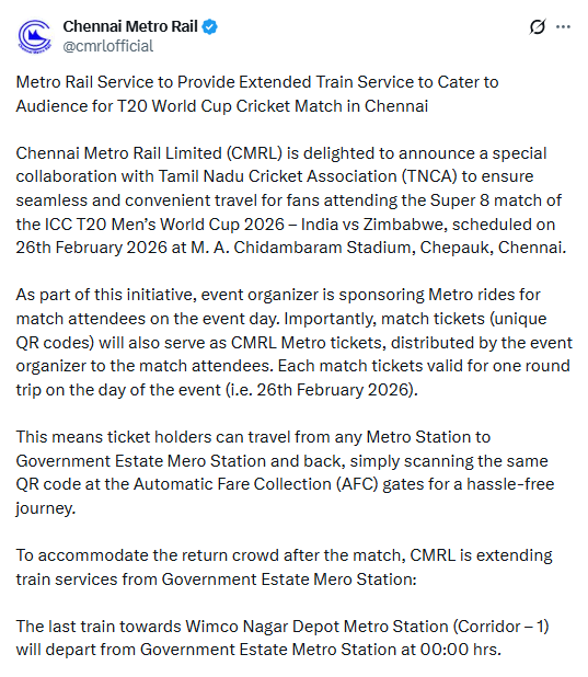 “Metro Rail Service to Provide Extended Train Service to Cater to Audience for T20 World Cup Cricket Match in Chennai Chennai Metro Rail Limited (CMRL) is delighted to announce a special collaboration with Tamil Nadu Cricket Association (TNCA) to ensure seamless and convenient travel for fans attending the Super 8 match of the ICC T20 Men’s World Cup 2026 – India vs Zimbabwe, scheduled on 26th February 2026 at M. A. Chidambaram Stadium, Chepauk, Chennai.”