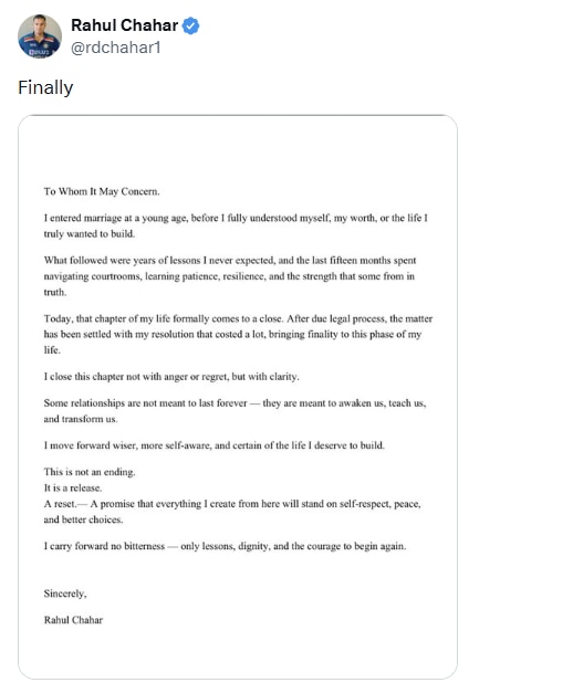 Chennai Super Kings’ latest spin acquisition, Rahul Chahar, on Friday, February 20, confirmed his divorce from wife Ishani Johar through a detailed social media post, formally bringing an end to their marriage after more than three-and-a-half years.