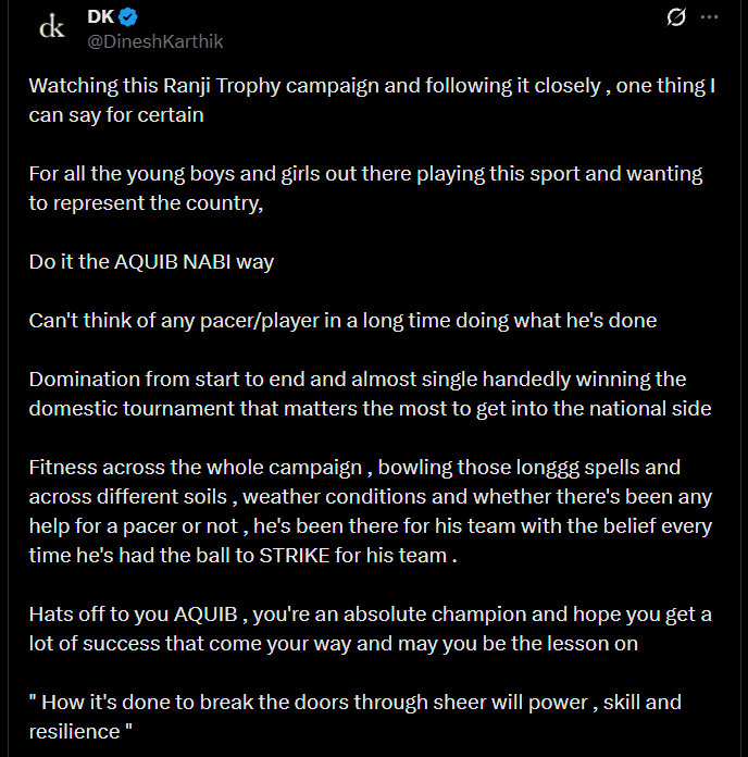 “Watching this Ranji Trophy campaign and following it closely, one thing I can say for certain, for all the young boys and girls out there playing this sport and wanting to represent the country — do it the AQUIB NABI way,” Karthik wrote.