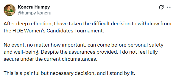 Taking to X on Sunday, Humpy wrote, “After deep reflection, I have taken the difficult decision to withdraw from the FIDE Women’s Candidates Tournament. No event, no matter how important, can come before personal safety and well-being. Despite the assurances provided, I do not feel fully secure under the current circumstances.