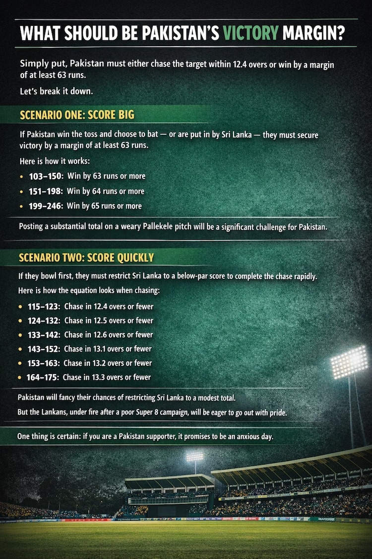 If Pakistan win the toss and choose to bat — or are put in by Sri Lanka — they must secure victory by a margin of at least 63 runs.