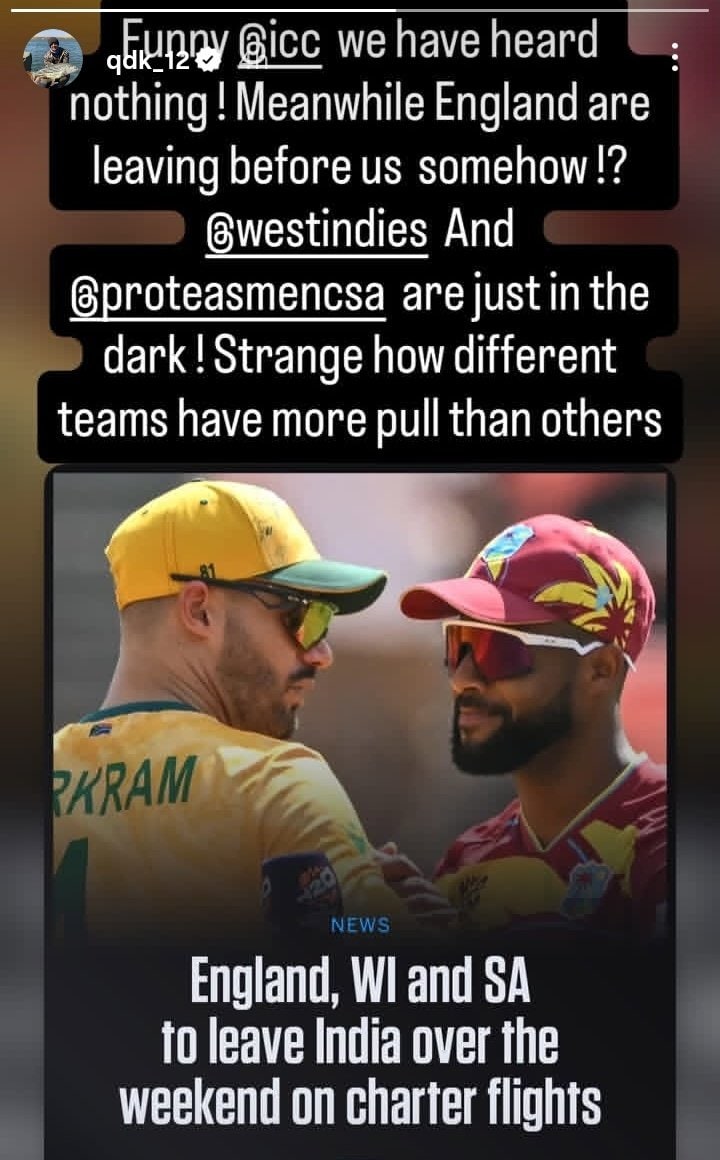 Reacting this De Kock took to Instagram stories to vent his frustration on the quick response to the England team. “Funny @icc, we have heard nothing! Meanwhile, England are leaving before us somehow? @westindies and @proteasmencsa are just in the dark! Strange how different teams have more pull than others,” De Kock wrote on his Instagram story.