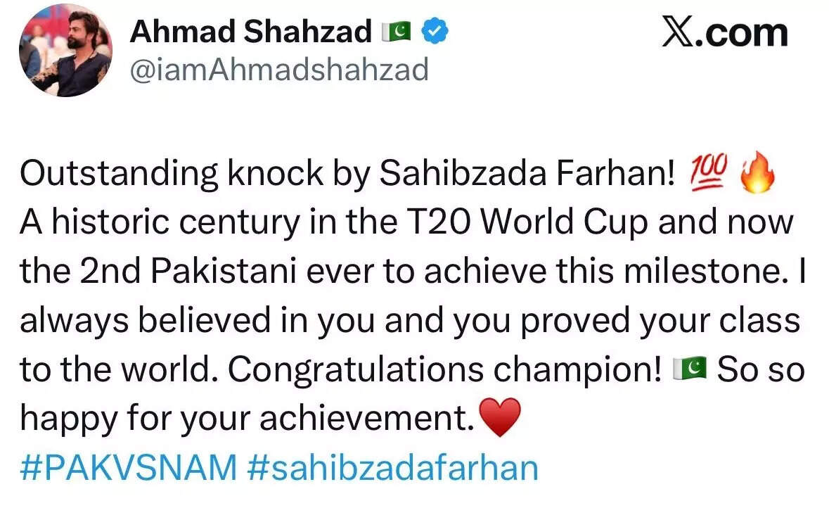 Ahmad Shehzad was among the first to applaud Farhan’s outstanding knock. He wrote on X: “A historic century in the T20 World Cup and now the second Pakistani ever to achieve this milestone. I always believed in you and you proved your class to the world. Congratulations, champion. So happy for your achievement.”