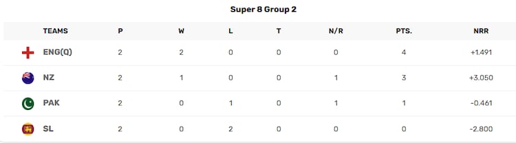 After the dominant win, New Zealand’s NRR has now shot up to +3.050, meaning they are the favourites to reach the semi-final from Group 2, behind England. However, Pakistan are still alive in the tournament and need to beat Sri Lanka in their final Super 8s match.