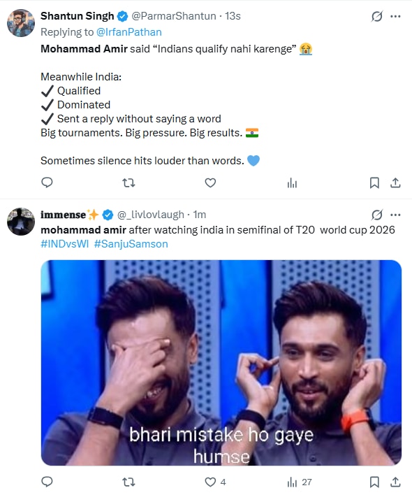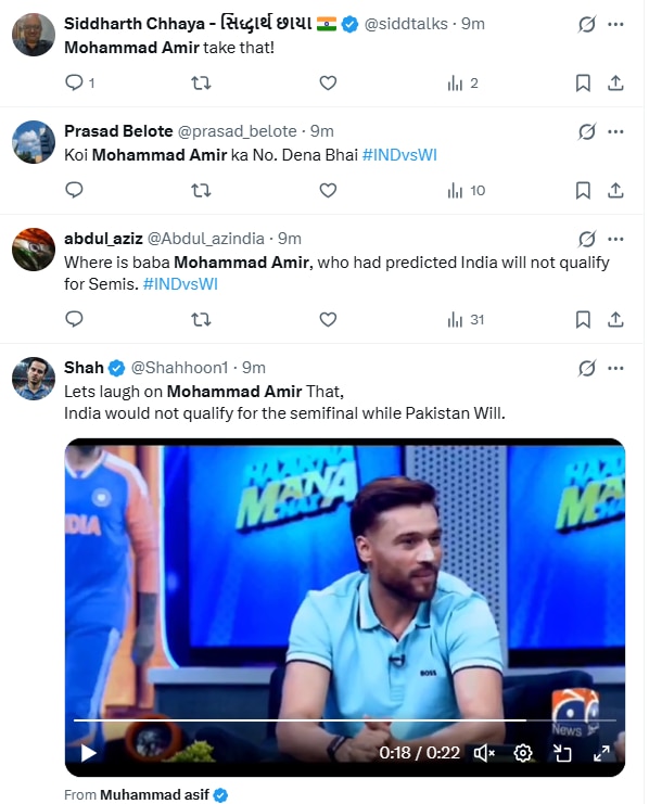 India, however, responded strongly on the field. They began their Super 8 campaign with a painful 76-run defeat against South Africa. But they made a stupendous comeback, beating Zimbabwe at the Wankhede Stadium, and then outclassed West Indies to book their semifinal berth. After India stormed into the last four, fans took to social media to call out Amir for his premature prediction.