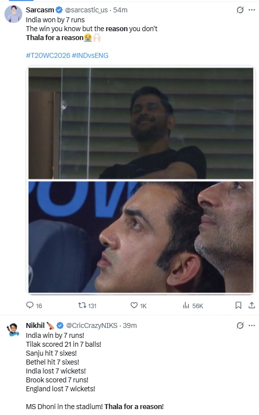 The phrase, which has become a widely shared meme among cricket fans, is linked to Dhoni’s iconic jersey number seven and his status as “Thala”, meaning leader, among supporters of the Chennai Super Kings. As India edged England in a tense finish, social media platforms were flooded with posts crediting Dhoni’s presence for the result. Many users repeated the phrase “Thala for a reason,” a sentiment that trended through the night.