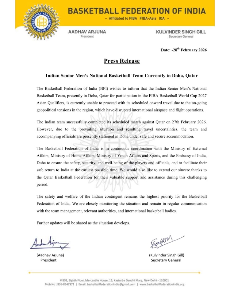 The conflict has also left other Indian sporting contingents stranded in the region. The Basketball Federation of India confirmed via X that the Indian Senior Men’s National Basketball Team is currently stuck in Doha, Qatar, following their match in the FIBA Basketball World Cup 2027 Asian Qualifiers.