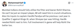 “So, yes, Rohit would be expected to bat the same way, see the ball, hit the ball; that is what I am thinking for the entire Mumbai Indians setup, unless the pitch is asking you to play a slightly different brand of cricket,” he added.