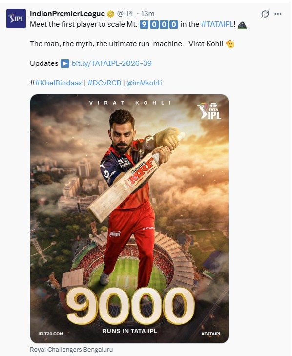 Kohli needed 11 runs to reach the landmark and got there comfortably. On the final ball of the powerplay, with RCB chasing 76, he drove Axar Patel down the ground to long-off for a single to bring up the milestone. The feat further strengthened his position at the top of the all-time run charts, with second-placed Rohit Sharma trailing by around 1900 runs.