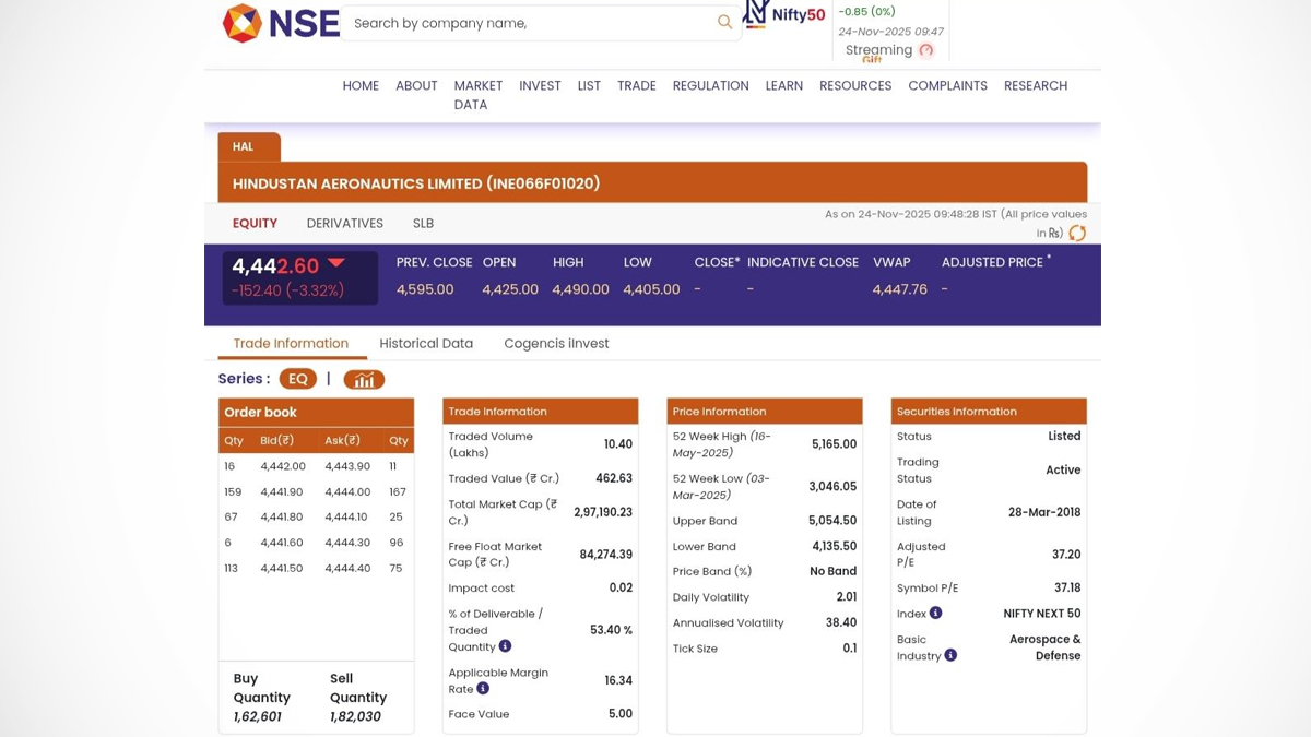 Shares of Hindustan Aeronautics Ltd (HAL) fell over 3% in early trading on Monday, November 24, following the crash of a Tejas fighter jet during the Dubai Air Show on November 21. The incident resulted in the tragic death of an Indian Air Force (IAF) officer.