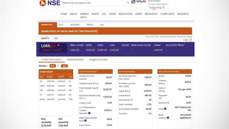 Whirlpool Share Price Today, November 27: (Photo Credits: NSE)