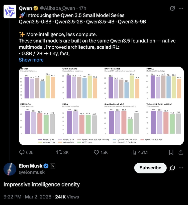 Meanwhile, the launch of these small model series of Qwen is also drawing attention from the wider AI community. xAI boss Elon Musk reacted to the results on X, calling it “impressive intelligence density” in response to the benchmark comparisons shared for the latest Qwen 3.5 small series.