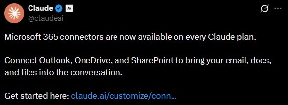 Claude’s official X account announced the update. The post read, “Microsoft 365 connectors are now available on every Claude plan. Connect Outlook, OneDrive, and SharePoint to bring your email, docs, and files into the conversation.”