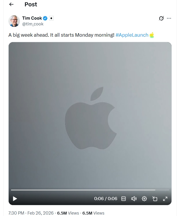 Apple is preparing for a packed week of product announcements starting Monday, March 2, with CEO Tim Cook confirming that new launches will begin “Monday morning”. While the company is not expected to host a large, stage-driven keynote, the coming days are likely to see a steady flow of hardware reveals through press releases and product videos, followed by a hands-on media experience later in the week.