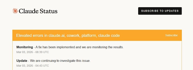 Update: Anthropic’s Claude Status page states that the company has implemented a fix. The update states, “A fix has been implemented and we are monitoring the results.”