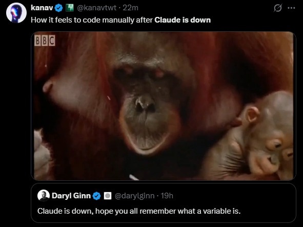 Though some users also joked that with the AI model down, they may have to start coding manually again. One person shared a video of an orangutan trying to cut wood, and wrote, “How it feels to code manually after Claude is down.”