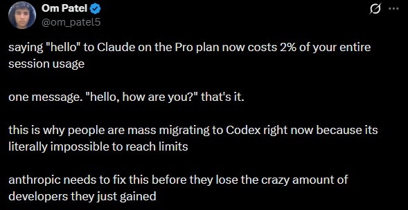 One user wrote that his usage limit was reduced drastically for sending just a “hello” to Claude. The user wrote, “Saying ‘hello’ to Claude on the Pro plan now costs 2 per cent of your entire session usage.”