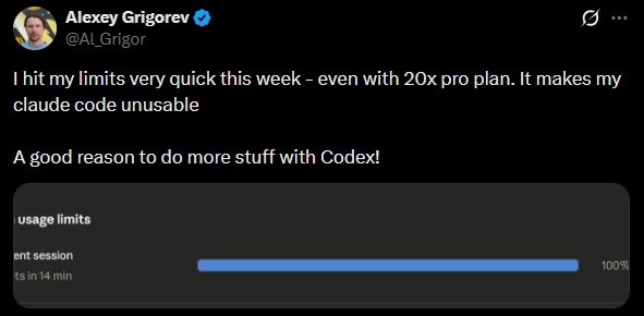 Many users found themselves frustrated on social media. Some considered potentially switching to OpenAI’s coding agent Codex. One user added, “I hit my [Claude Code’ limits very quick this week – even with 20x pro plan. It makes my claude code unusable. A good reason to do more stuff with Codex!”